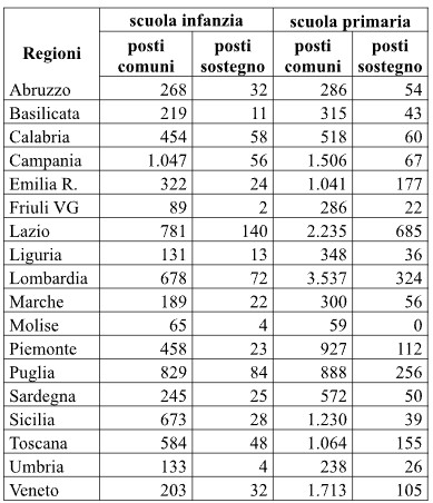 In considerazione del fatto che moltissimi candidate/i opteranno per la partecipazione ad entrambi i concorsi, riportiamo di seguito per ogni regione il numero complessivo dei posti previsto dal bando nelle due tipologie di posti comuni e di sostegno per entrambi gli ordini di scuola.