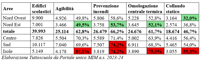 Al contrario, le situazioni peggiori per edifici scolastici privi di certificazione, con percentuali sopra la media nazionale, si trovano nelle aree centrali e meridionali, con una situazione pesante, soprattutto, per le Isole.
